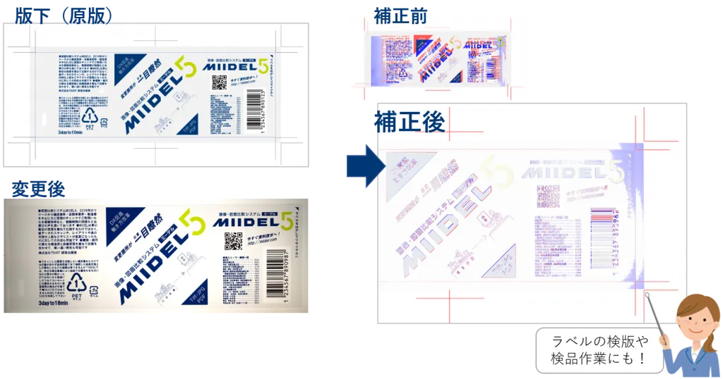 印刷業界において、カラー印刷されたピローフィルムやラベルの内容(一括表示やプラマークなど)と版下の変更有無といった照合に活用頂いています。